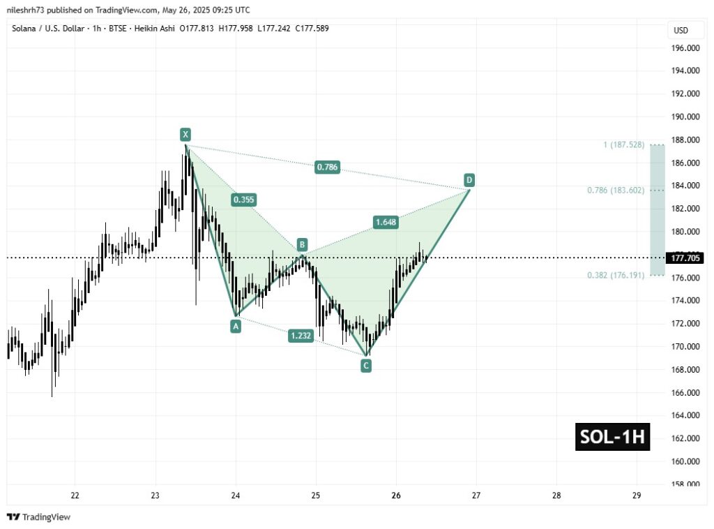 The pattern began to form on May 23. SOL reached a short-term peak at $187.52, marked as point X, before experiencing a significant correction. The price dropped by over 9%, finding support near $169 on May 25, identified as point C.