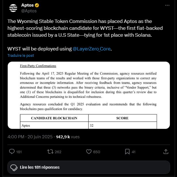 Aptos is another “Made in the USA” project to closely monitor, at the heart of the expansion of stablecoins. The State of Wyoming is planning to launch its own stablecoin, the Wyoming Stable Token (WYST), with Aptos being a key candidate for the underlying blockchain infrastructure.