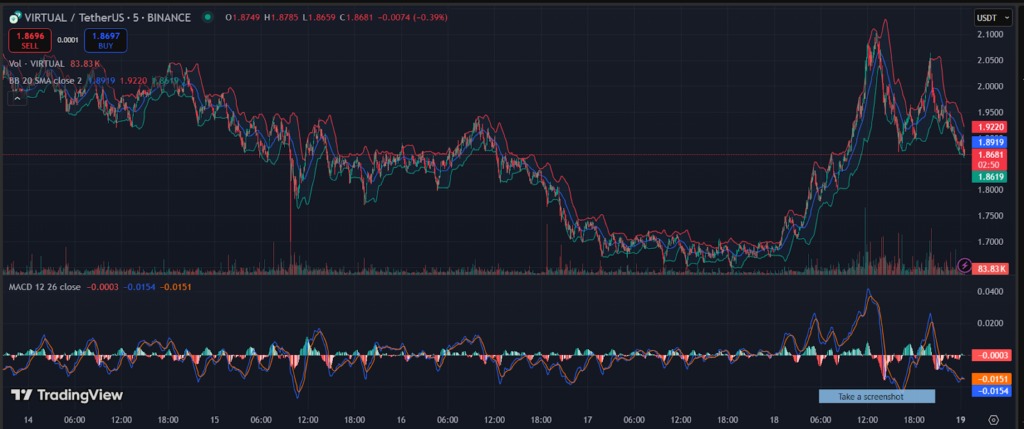 Short-term trends for VIRTUAL appear to be both favourable and unfavourable based on the charts. At $1.88, the price is near the average, and the Bollinger Bands indicate some developing volatility. From these figures, the price is close to a support level, with the upper band around $1.92 and the lower band at approximately $1.86.