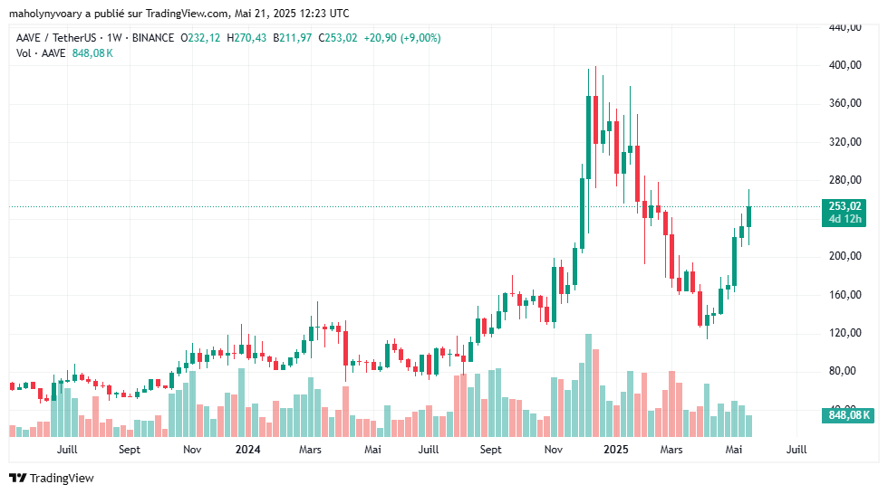 The AAVE token currently displays a price between 245 and 265 $, with a market capitalization of 3.94 billion dollars, positioning it among the top 40cryptocurrencies by capitalization. This valuation testifies to investors’ confidence in this major decentralized finance protocol.