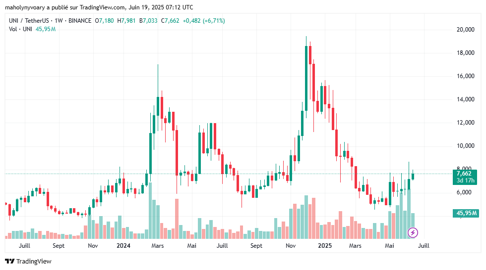 In June 2025, the UNI token is displaying a price oscillating around $7.6. Technical analysis reveals encouraging signals for the continuation of this bullish trend. Crypto analysts identify a breakout momentum that could propel UNI towards the technical target of $10 in the coming weeks. This projection is based on the formation of successive supports above $7.40 and a notable increase in transaction volumes.