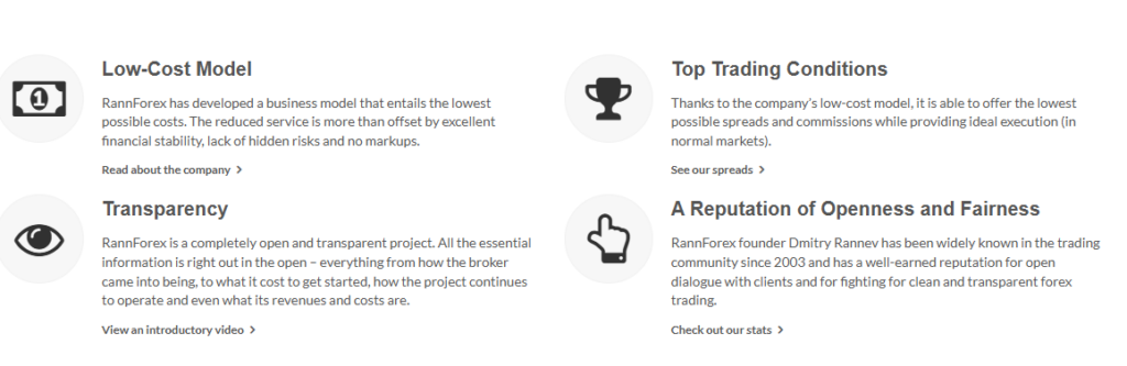 Transparency is another core value of RannForex. The broker presents itself as a completely open project, where all essential information is accessible: from the broker’s creation, startup costs, and operational methods, to revenues and expenses. This total transparency policy is relatively rare in the online trading industry.