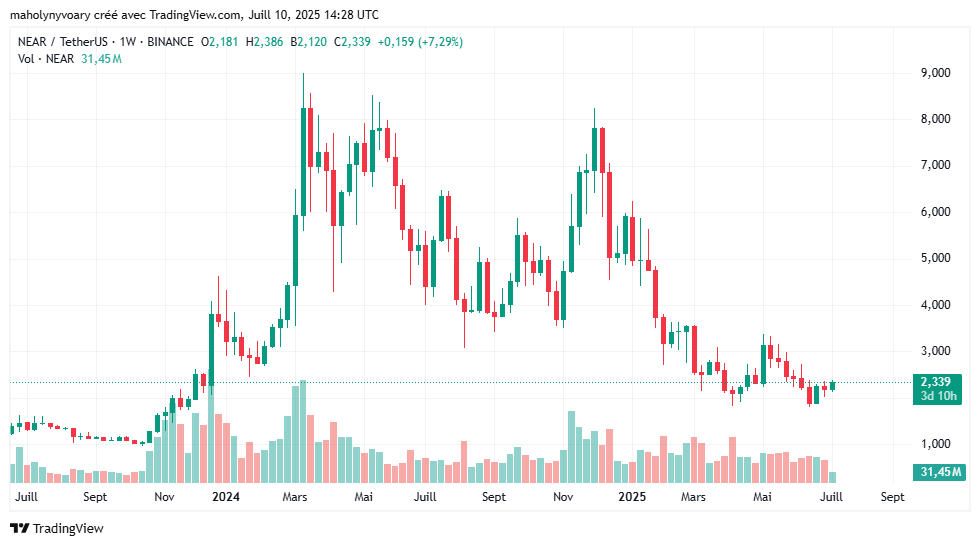 La evolución reciente del precio de NEAR muestra un rendimiento contrastado en 2025. En julio de 2025, el token superó la resistencia de 2,19 dólares con un pico de volumen de 1,97 millones comparado con la media de 1,22 millones. Sin embargo, el precio también experimentó correcciones, notablemente una caída del 5% a principios de julio cuando la resistencia de 2,30 dólares no pudo mantenerse.