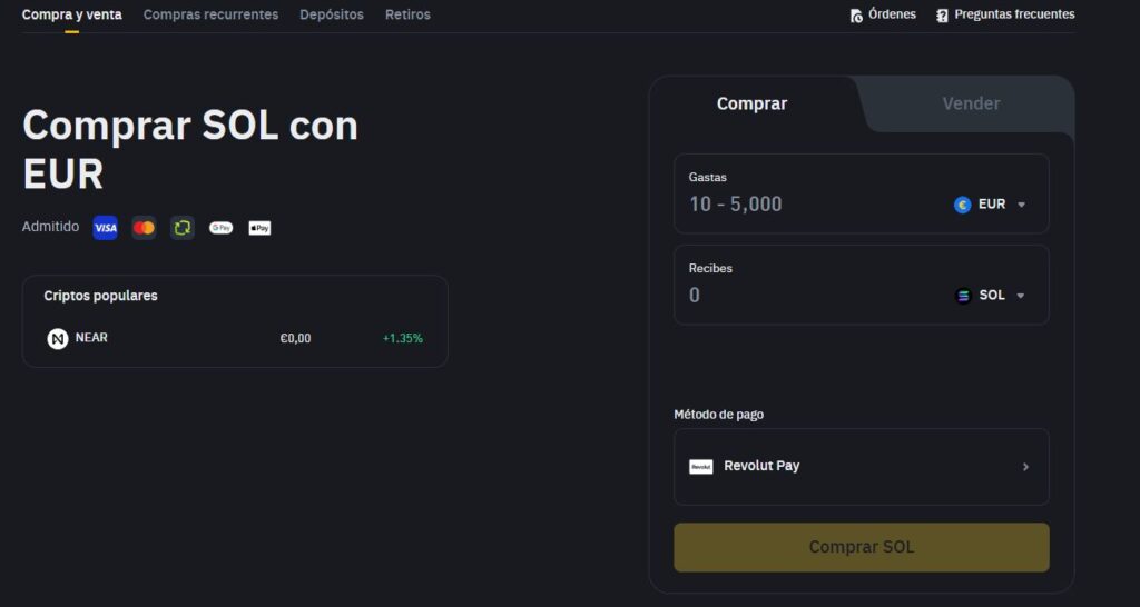Navegar hacia la sección de compra: Una vez confirmado tu depósito, dirígete hacia la sección «Comprar cryptos» o «Trading al contado». Busca el par SOL/EUR en la lista de criptomonedas disponibles.