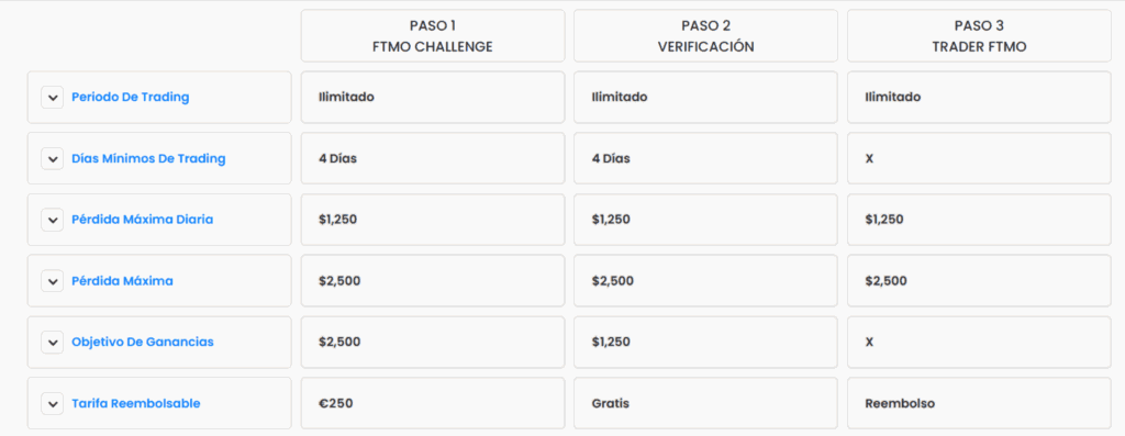 El precio del FTMO challenge depende del capital que deseas tener a disposición para operar. El importe mínimo es de 155 € para un capital de 10.000$ y un riesgo normal. La plataforma proporciona hasta 200.000$ en una cuenta FTMO.