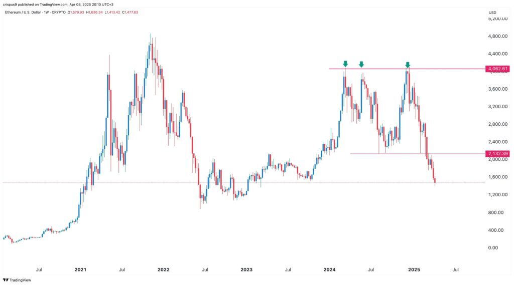 Desde el punto de vista técnico, Ethereum ha experimentado una caída brusca después de formar un patrón de triple-top bajista en el gráfico semanal. Este patrón está compuesto por tres picos alrededor de $4,062 y una línea de cuello en $2,132. Este nivel de soporte clave fue probado por última vez el 5 de agosto. Ethereum ahora ha caído por debajo de esta línea de cuello, confirmando la señal bajista. El precio también ha cruzado a la baja las medias móviles de 50 y 100 semanas, abriendo camino a un próximo objetivo de precio en $1,000.
