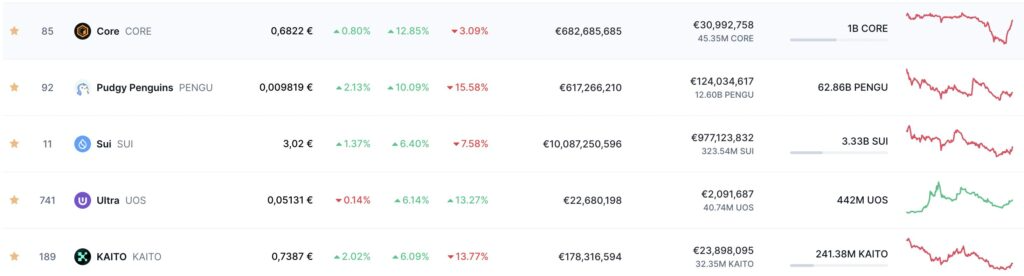 Core (CORE) lidera con cerca de 13% de ganancias, beneficiándose de más de 133 integraciones que impulsan su plataforma. Walrus (WAL) también se recupera con más del 10% de aumento, después de haber sido el mayor perdedor durante el fin de semana anterior. Mientras tanto, Flare (FLR), Pudgy Penguins (PENGU) y Fartcoin (FARTCOIN) también han experimentado ganancias interesantes, seguidos de Bonk (BONK) y Sui (SUI).