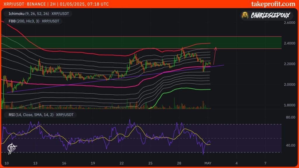 El XRP se mantiene en un rango a largo plazo, operando justo por encima del nivel de retroceso del 38,2% de Fibonacci. Esta zona técnica se asocia comúnmente con las correcciones de la onda 4 en la teoría de Elliott. En el momento de la redacción, el XRP ha retrocedido más de 2% para establecerse en 2,20 $.