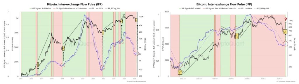 Uno de los indicadores más reveladores de este cambio de dinámica es el Inter-Exchange Flow Pulse, que recientemente ha cruzado al alza su media móvil de 90 días. Históricamente, esta señal aparece cuando la liquidez de los exchanges comienza a girar con un verdadero objetivo. No se trata de ruido generado por los inversores particulares, sino de la actividad de los market makers, las mesas de arbitraje y las ballenas que reposicionan su capital. Giros similares han precedido fases de expansión importantes en 2016, 2019 y 2023.