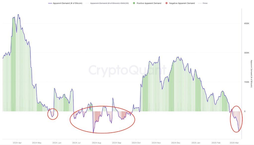 Entre las principales señales de alerta, se destaca en primer lugar la disminución de la «demanda aparente» de Bitcoin, que ha disminuido significativamente en las últimas semanas. Según los datos de la plataforma de análisis CryptoQuant, este indicador – que mide la diferencia entre la producción de BTC y las variaciones de las reservas inactivas – ha caído en terreno negativo a finales de febrero, llegando a -93.700 BTC en el momento de la redacción de este artículo.