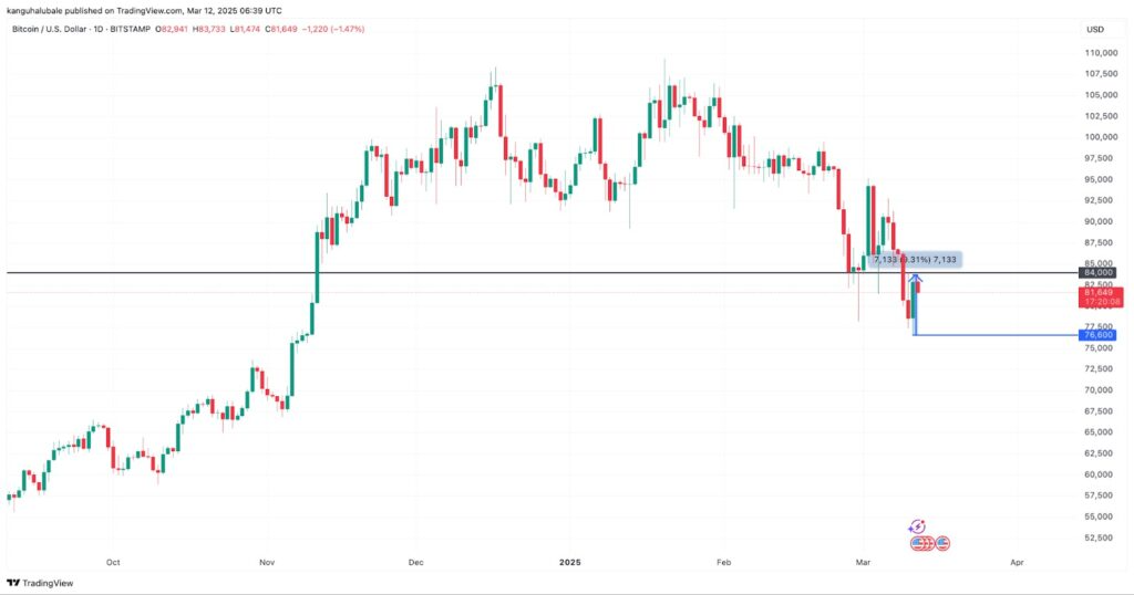 Desde el punto de vista técnico, Bitcoin actualmente se encuentra en un «patrón de bandera bajista», un patrón gráfico que a menudo indica una continuación de la tendencia a la baja. Después de caer de 92.000 a 76.600 dólares entre el 6 y el 11 de marzo, el BTC ha consolidado posteriormente en un canal ascendente, pero acaba de romper a la baja un nivel de soporte crucial en los 82.000 dólares.