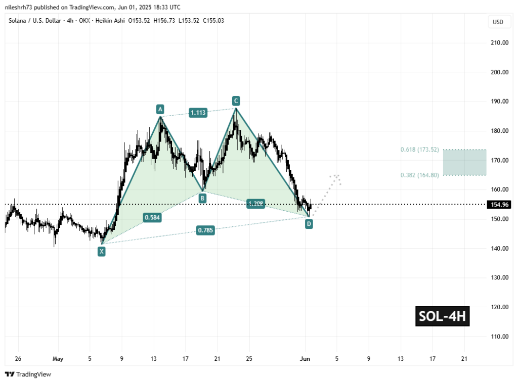 En el gráfico de 4 horas de Solana, se pueden observar las diferentes fases de esta configuración armónica en formación. Comenzó con un fuerte rally entre el punto X y el punto A, seguido de un retroceso hasta el punto B, en el nivel de retracement de Fibonacci 0,584. Luego, se observa un nuevo movimiento alcista en dirección al punto C (cerca de la extensión 1,113). Esto llevó el precio al punto D, alrededor de la extensión 1,308 de la pierna XA.