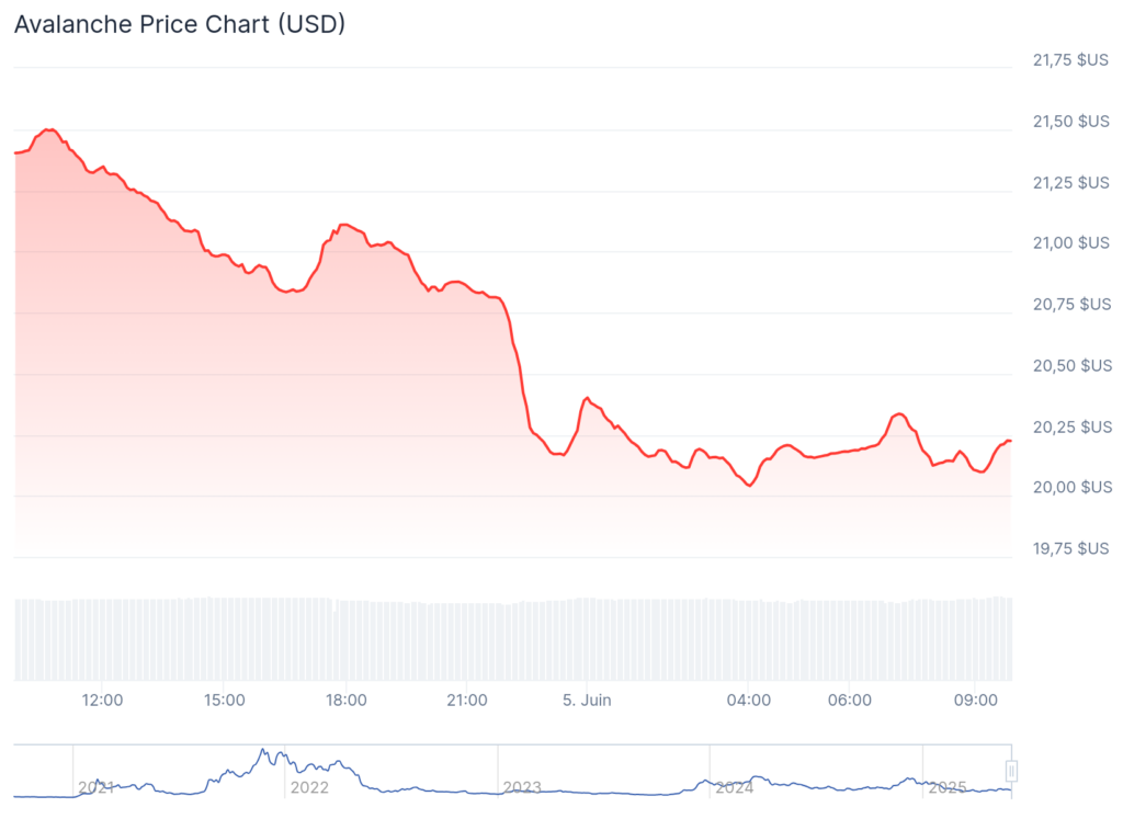 El Avalanche (AVAX) experimentó una caída de casi el 4% este miércoles, debido a la ruptura de un nivel de soporte técnicocrucial en 21,05 dólares. Esta ruptura, acompañada de un alto volumen de operaciones, ha acentuado la espiral bajista de la criptomoneda, alimentando temores entre los inversores de nuevas pérdidas potenciales a corto plazo.