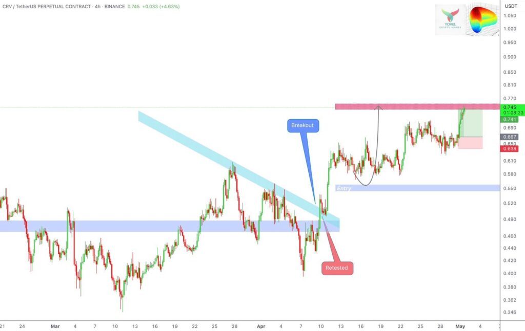 CRV acaba de romper esta estructura al alza, una señal que los traders están vigilando de cerca. Cotizando actualmente alrededor de 0,74 $, el token está probando niveles clave de Fibonacci, entre 0,55 $ y 0,60 $.