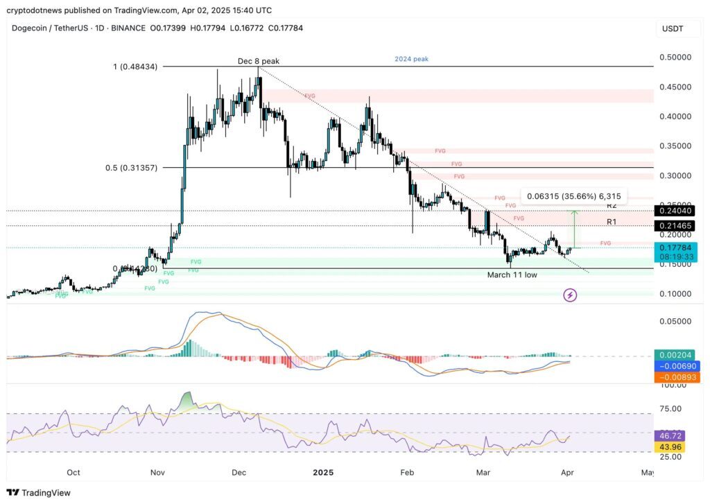 Dos indicadores técnicos clave, el RSI y el MACD, respaldan una tendencia alcista para el Dogecoin. El RSI está en 46 y en alza, mientras que el MACD muestra barras verdes sobre la línea neutral. Estos elementos indican un momento positivo subyacente en la tendencia de precios del DOGE.