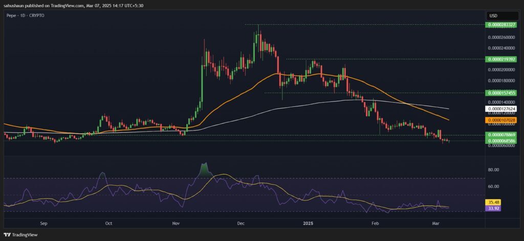 El análisis técnico de la memecoin de la rana no sugiere un cambio de tendencia a corto plazo. De hecho, el precio está operando por debajo de los promedios móviles de 50 y 200 días, señalando una tendencia a la baja bien establecida. Además, los indicadores MACD y RSI también se encuentran en territorio negativo, confirmando la dominancia de las fuerzas vendedoras.
