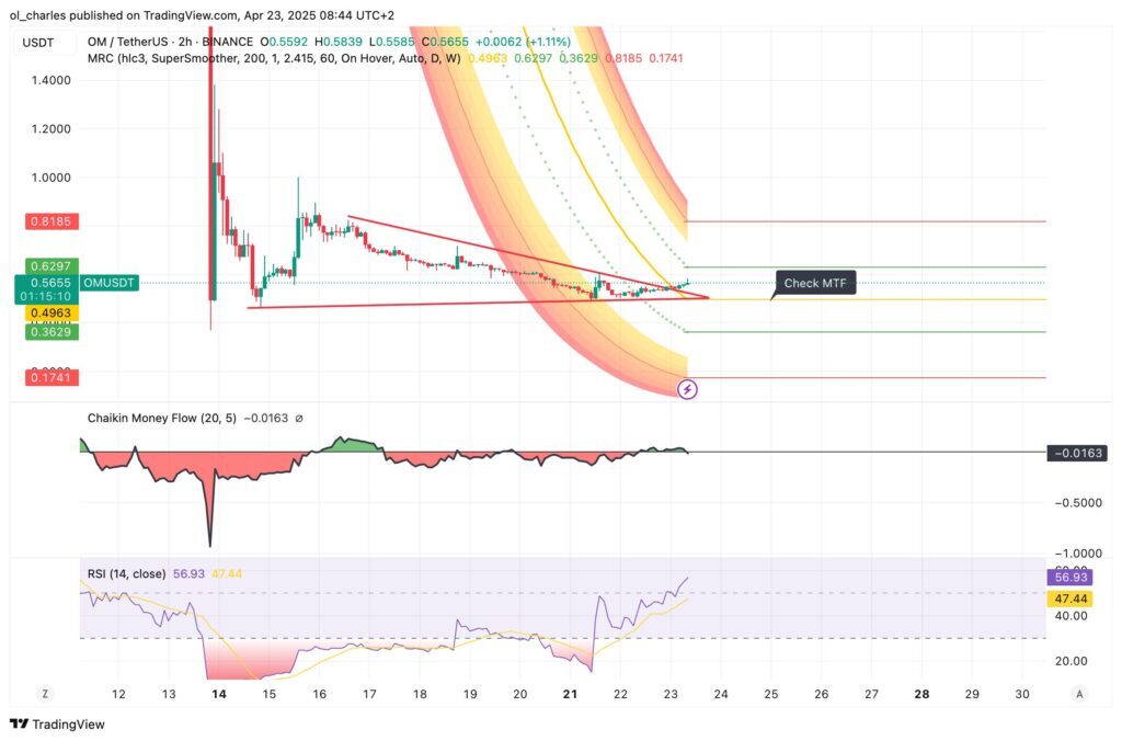 Antes de siquiera considerar un regreso a 1 dólar, OM acaba de salir de una tendencia bajista en 2 horas. El canal de Mean reversion indica una zona de resistencia entre 0,74 y 0,90 dólares donde OM podría volver a bajar si el mercado no permite tal euforia.