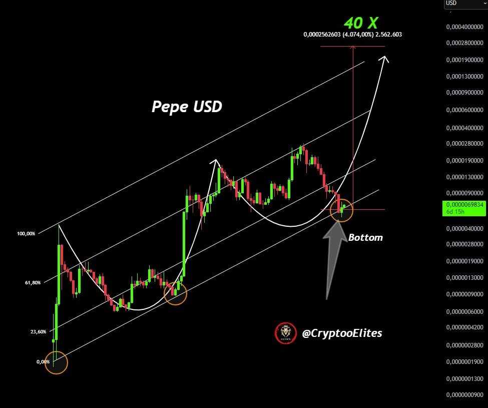 Los niveles de retracement de Fibonacci coinciden con esta configuración, reforzando la convicción de que PEPE ha establecido una zona de soporte sólida. Según las proyecciones del analista, PEPE podría estar en camino de lograr un impresionante rally de 40x desde sus niveles actuales, si sigue las tendencias de sus fases de expansión anteriores.