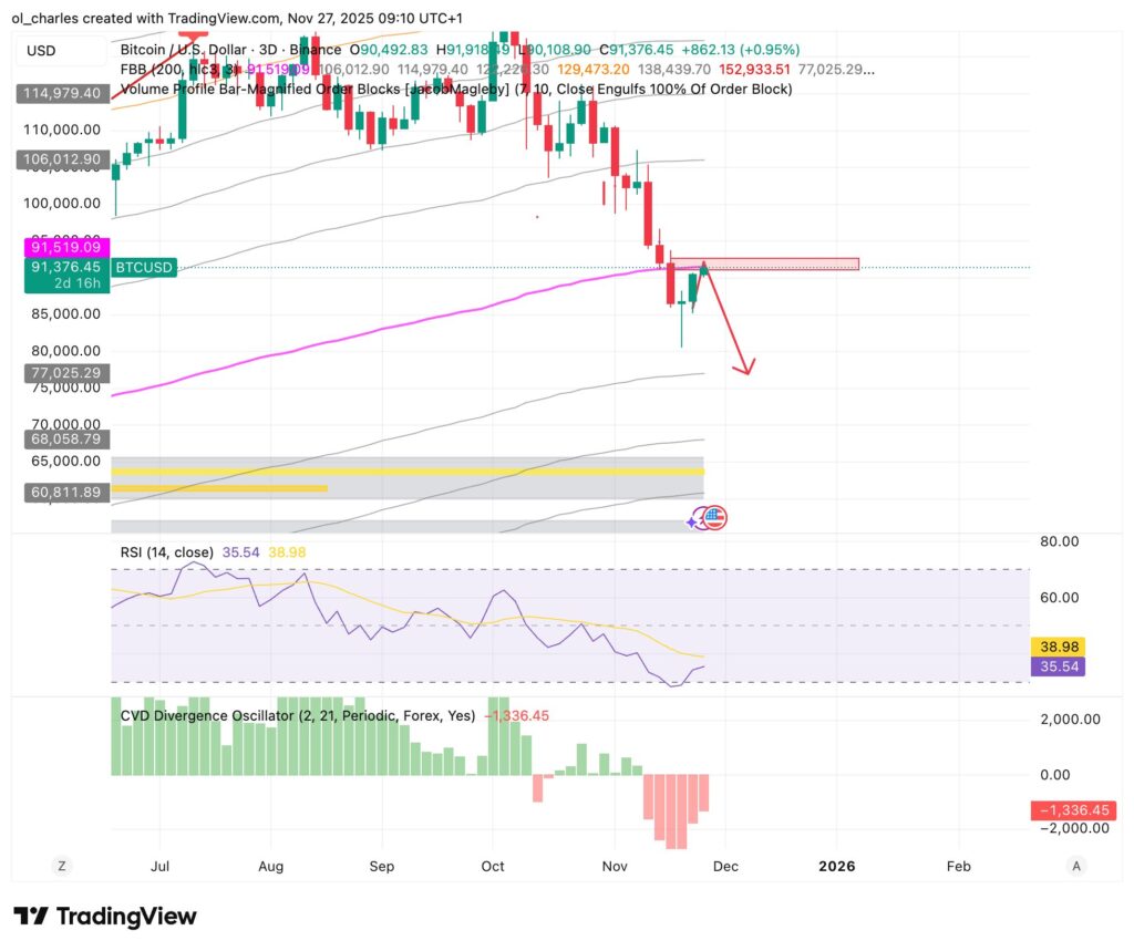 El FBB en 3 días muestra una línea mediana en 91.400 dólares. Mientras el BTC no se mantenga por encima, los riesgos de caídas siguen presentes.