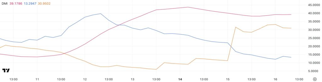El análisis del Índice de Movimiento Direccional (DMI) de la red Pi muestra un cambio de tendencia claro, pasando de una tendencia alcista a una tendencia bajista. El índice ADX, que mide la fuerza de una tendencia, ha pasado de 43,68 a 39,17 en solo dos días. Esto es una señal de que la dinámica alcista se está debilitando ante una creciente presión vendedora.
