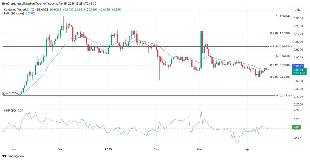 En el gráfico diario de ADA/USD, el indicador de flujo de dinero de Chaikin (CMF), actualmente positivo en 0.04, refuerza esta perspectiva alcista. Este indicador señala que la presión de compra supera a la presión de venta, reflejando importantes entradas de capital en ADA. Los inversores parecen estar acumulando en lugar de liquidar sus posiciones.