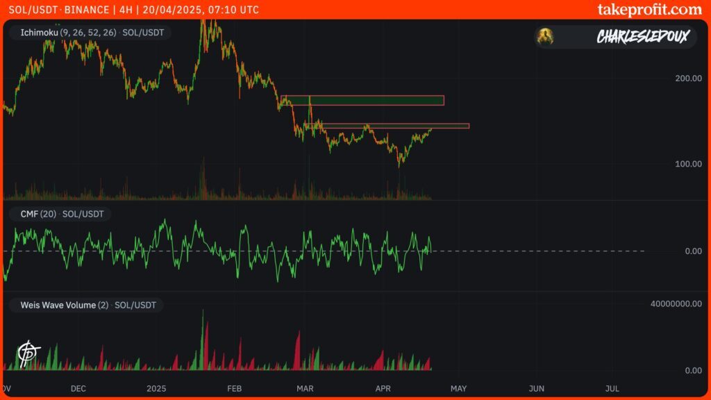 Si Solana logra convertir este nivel en soporte, abrirá el camino para una continuación del movimiento alcista hacia la resistencia y la próxima zona de demanda (en rojo) en 180 $, un obstáculo especialmente persistente para SOL en los últimos meses.
