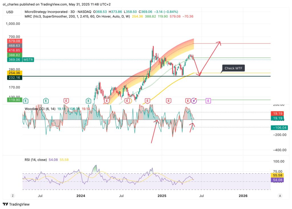 En segundo lugar, el análisis técnico de la acción MSTR muestra signos alentadores de recuperación. El gráfico diario revela la formación de un doble suelo en 236,10 $ entre marzo y abril, seguido de un rompimiento alcista por encima del nivel de 341,55 $ el 23 de abril.