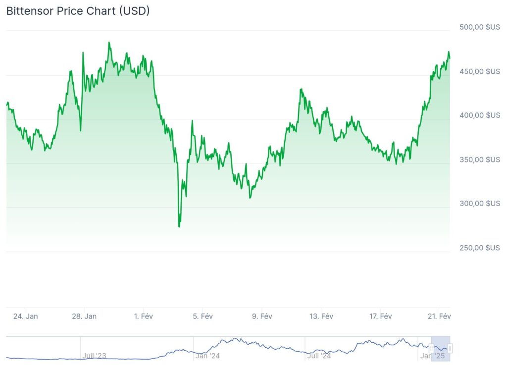 El crecimiento potencial de Bittensor está respaldado por el entusiasmo global por la inteligencia artificial y las aplicaciones descentralizadas. Los analistas predicen que si esta tendencia continúa, el TAO podría superar los 800 $ para finales de 2025.