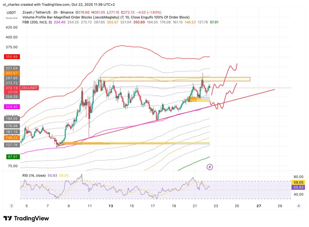 En caso de continuación alcista, ZEC podría alcanzar los 350 dólares, según el FBB, si rompe su resistencia en 296 dólares.