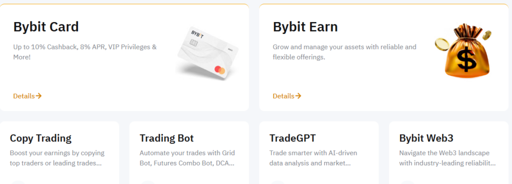 Bybit offre le trading Spot et Dérivés, des services d’épargne (Earn), un Launchpad pour nouveaux projets, et un marché NFT.