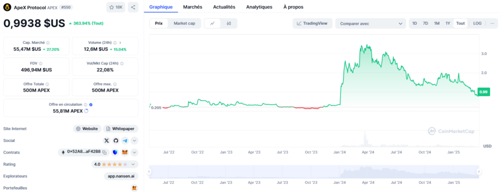 Le prix d’APEX est resté relativement stable pendant une partie de 2023, avant de connaître une envolée spectaculaire début 2024. Le token a atteint son plus haut historique (ATH) le 27 mars 2024 à 3,86 $, porté par l’engouement autour des DEX et du trading on-chain. Depuis, APEX a subi une correction naturelle, revenant autour des 1 $, tout en maintenant un bon niveau de liquidité. Cette volatilité reste typique des tokens liés aux plateformes décentralisées en forte croissance.