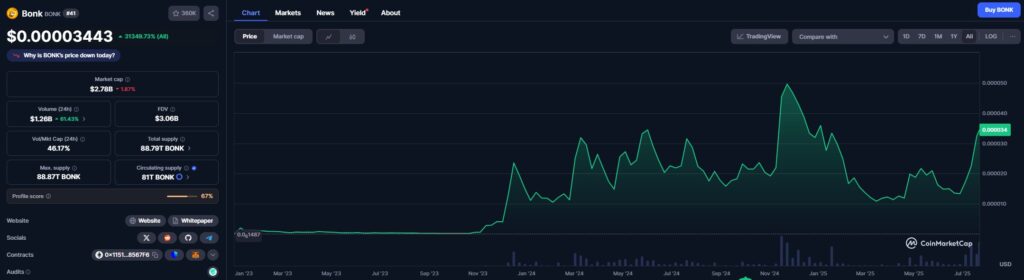 O preço do BONK apresenta uma trajetória notável desde o seu lançamento em dezembro de 2022. Atualmente avaliado em cerca de 0,000035 dólares, o token percorreu um caminho impressionante. Passou de uma distribuição gratuita para uma capitalização de 2,8 mil milhões de dólares. Isto posiciona-o no top 50 das criptomoedas por market cap.