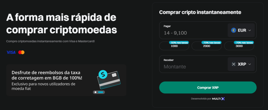 A compra de XRP por cartão de crédito ou débito é um dos métodos mais rápidos e mais simples. A maioria das plataformas aceita cartões Visa e Mastercard. As transações são geralmente instantâneas, permitindo obter os seus XRP em alguns minutos. No entanto, esta comodidade tem um custo, pois as taxas de transação por cartão são frequentemente mais elevadas que as de outros métodos de pagamento, geralmente entre 2% e 5%.