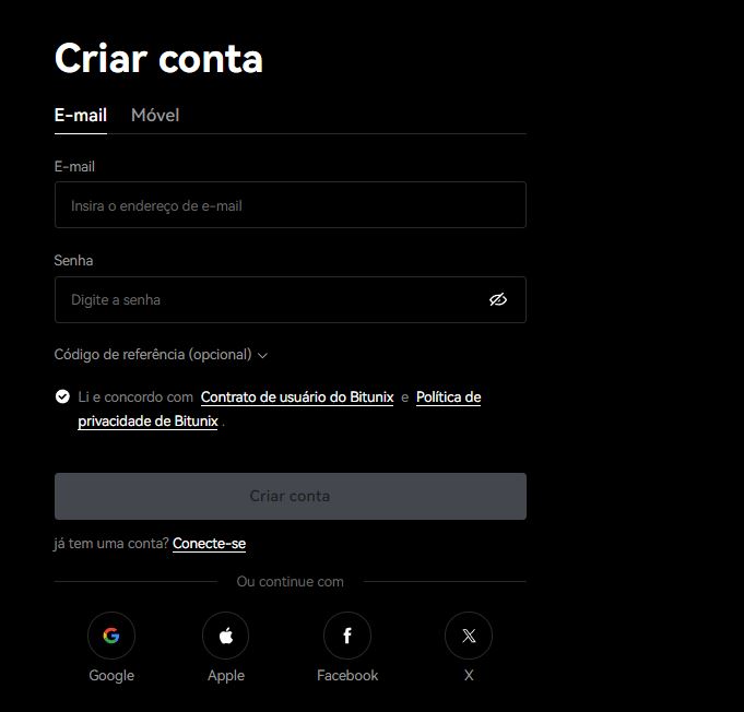 A inscrição na Bitunix é rápida e pode ser feita através do site ou do aplicativo móvel. Você pode criar uma conta utilizando seu e-mail, número de telefone ou redes sociais (Google, Apple, Facebook ou X).