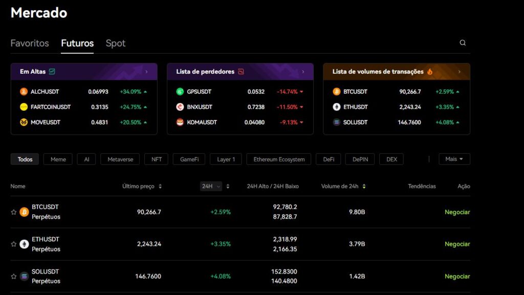 Os amantes do trading com alavancagem vão apreciar a possibilidade de ir até 125x nos futuros, ampliando as oportunidades de lucro.