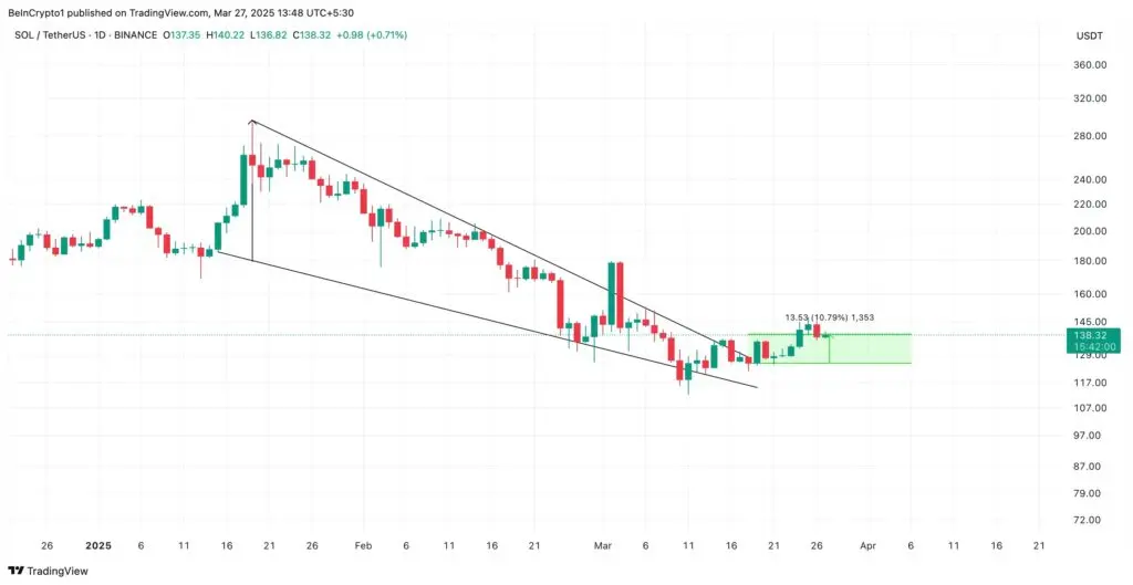 Foi exatamente o que aconteceu com o Solana nas últimas semanas. Após atingir um recorde histórico de 295,83 dólares em 19 de janeiro, o preço do SOL entrou em uma cunha baixista, sob a pressão dos vendedores. No entanto, em 19 de março, o ativo finalmente conseguiu romper a linha superior desse padrão, indicando uma possível inversão da tendência de alta.