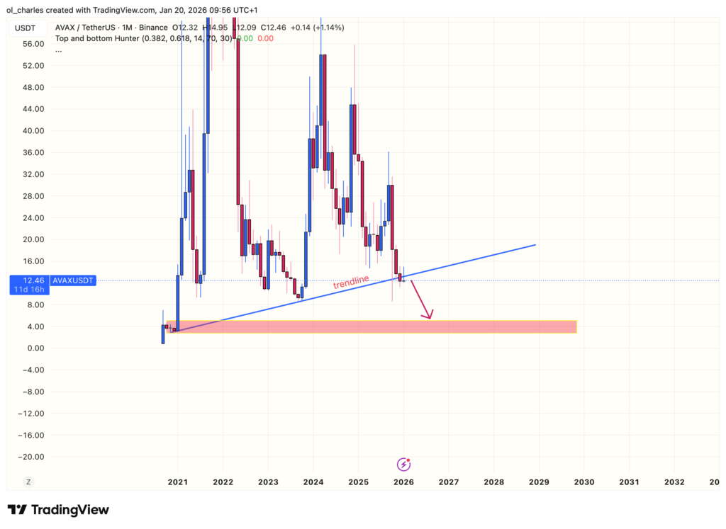De um ponto de vista técnico, a estrutura de mercado da AVAX oferece uma perspetiva preocupante. O token evolui agora abaixo da sua trendline altista em HTF. Se a AVAX não conseguir recuperar os 13,2$, expõe-se a um crash em direção à próxima zona de procura nos 5$.