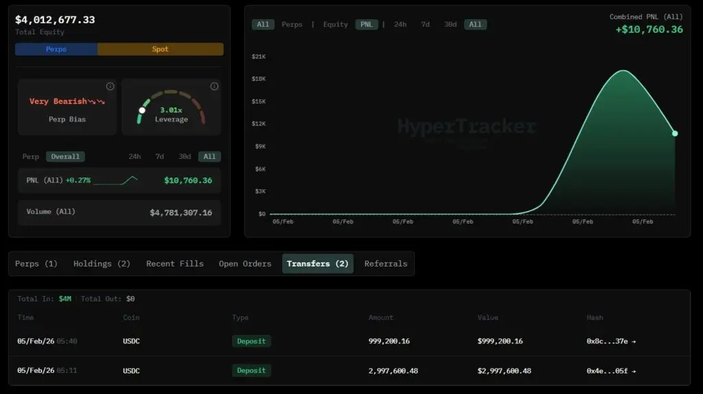 A operação não passa despercebida. Uma carteira recém-criada depositou 4 milhões de dólares em USDC na Hyperliquid antes de abrir imediatamente um short na Solana com uma alavancagem x3. Ao contrário das estratégias de cobertura (hedging) habituais, este movimento traduz uma convicção baixista pura (naked short).