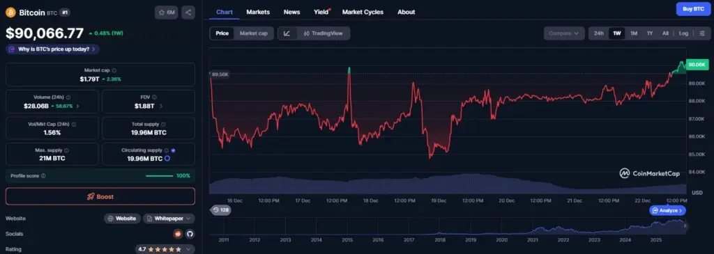 O BTC mantém com dificuldade o seu nível em torno dos 90 000 dólares enquanto os analistas multiplicam os avisos sobre uma eventual rutura baixista. Os dados on-chain revelam uma diminuição progressiva da pressão compradora, enquanto os volumes de negociação permanecem relativamente baixos para este nível de preço. Esta fraqueza do momentum preocupa os traders que vigiam de perto o suporte psicológico dos 88 000 dólares.