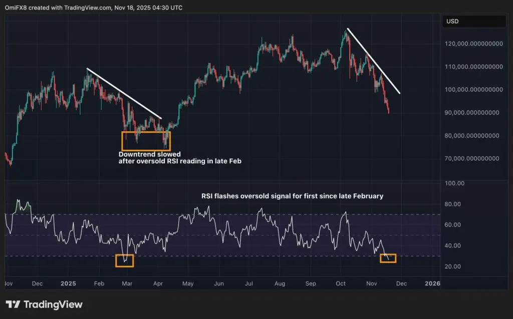 Historicamente, as zonas de sobrevenda do RSI precederam frequentemente recuperações técnicas do Bitcoin, por vezes de curta duração, outras vezes anunciadoras de verdadeiras inversões de tendência. Os dados dos ciclos anteriores mostram que quando o RSI do BTC desce abaixo de 30, uma recuperação de 5 a 15% ocorre nas duas semanas seguintes em cerca de 65% dos casos. Esta estatística atrai naturalmente os traders em busca de pontos de entrada tácticos.