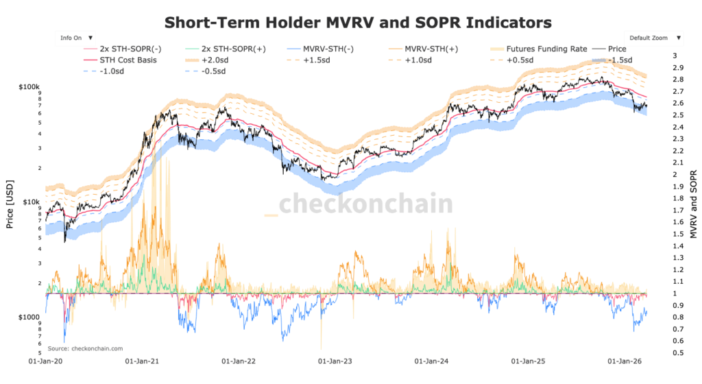 O gráfico do MVRV dos STH (preço médio de compra dos detentores a curto prazo) indica um fundo em torno dos 57 000 $ em caso de queda nas próximas semanas.