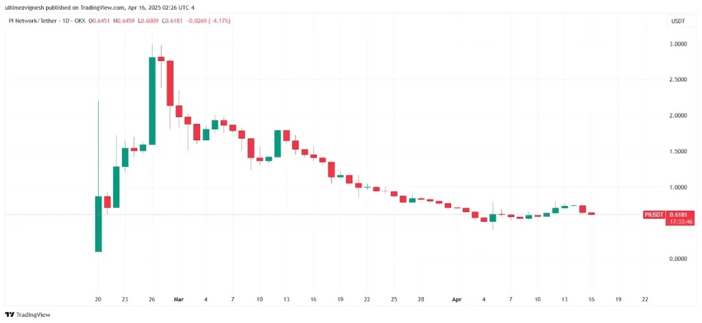 No entanto, desde 27 de fevereiro, a altcoin tem vindo a sofrer um declínio gradual no seu ímpeto. Entre 27 de fevereiro e 4 de abril, o preço caiu 81,58%. Desde 5 de abril, o mercado oscila entre 0,4040 $ e 0,7894 $. Atualmente, o PI está a ser negociado a 0,6174 $.