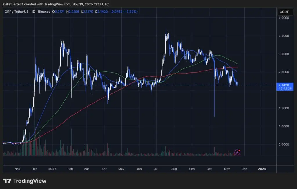 A análise do gráfico do XRP revela uma série clara de mínimos sucessivos acompanhada de falhanços repetidos para reconquistar as médias móveis chave. O preço oscila atualmente em torno de 2,14$, testando uma zona de suporte que funcionou várias vezes como piso psicológico e estrutural ao longo do ano.