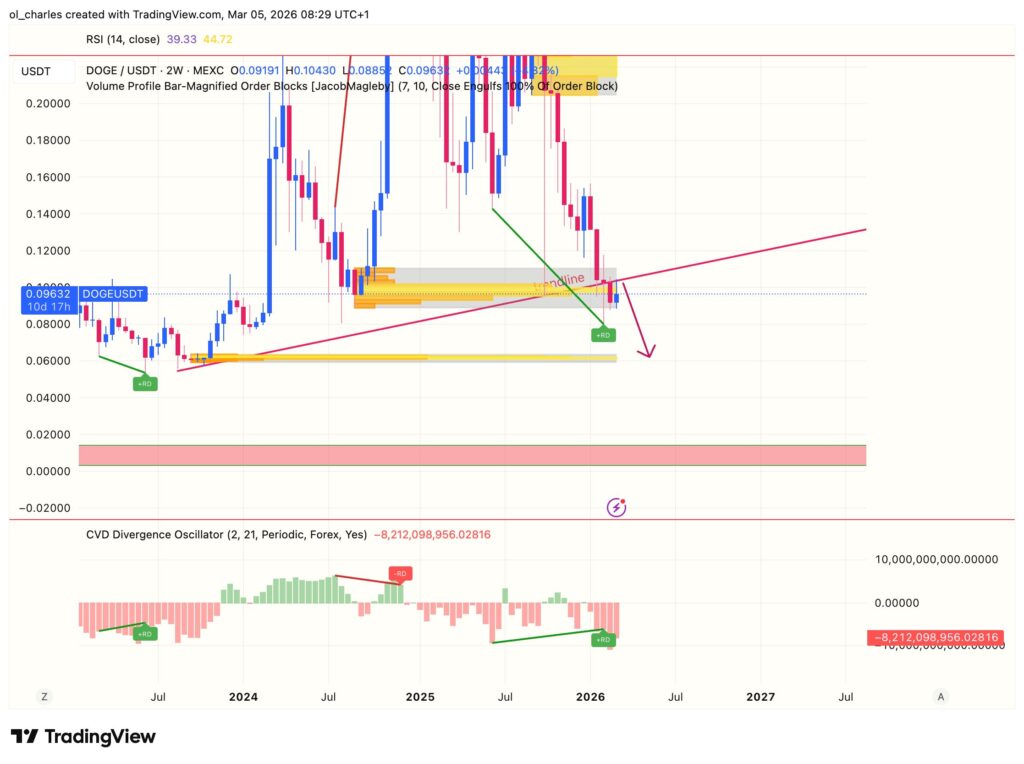 Do ponto de vista técnico, a configuração do Dogecoin encontra-se numa encruzilhada. O nível dos 0,088 $ impôs-se como a linha de defesa principal dos touros (bulls). Enquanto o preço se mantiver acima desta zona, a esperança de uma consolidação lateral permanece possível. A nova rejeição da trendline nos 0,104 $ correlacionada com a venda das baleias aumenta a probabilidade de uma perda do suporte e um regresso à zona de procura principal entre 0,67 e 0,54 $ nos próximos meses.