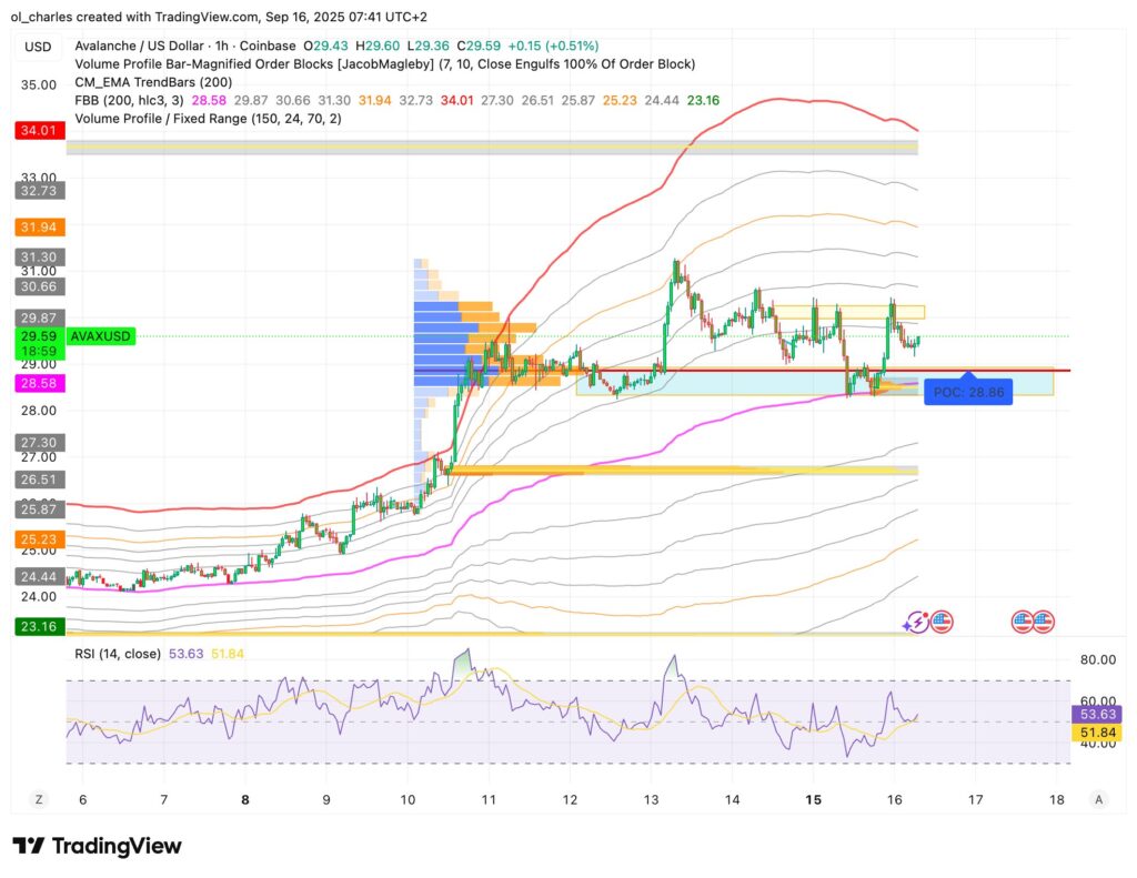 O AVAX também recuperou na sua zona de procura e até mostrou uma acumulação massiva ontem entre 28 e 28,7 dólares. Uma zona que deverá ser defendida pelo smart money.