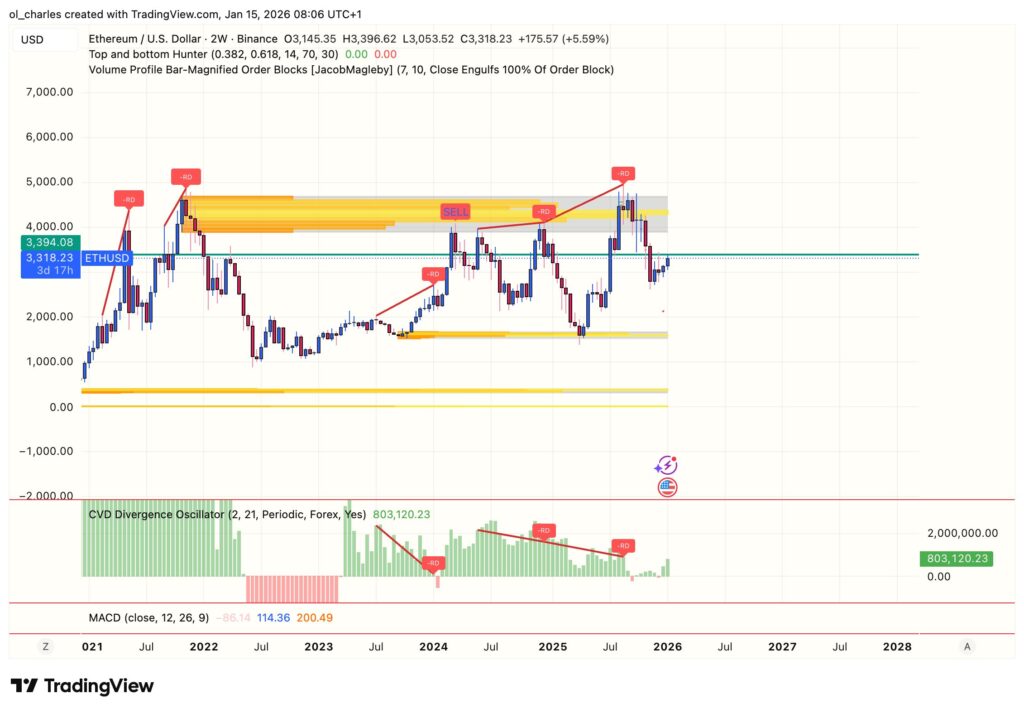 Para além dos movimentos das baleias, a análise técnica confirma que o Ethereum está numa encruzilhada. O preço do ETH está atualmente preso num triângulo simétrico, uma figura de compressão que precede frequentemente movimentos violentos. O order Block entre os 3800 $ e o seu ATH é uma zona importante de resistência que representa o desafio a superar para os bulls.