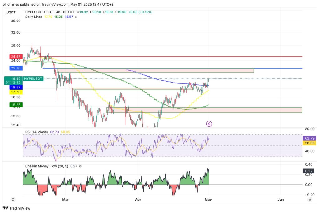 Enquanto muitos altcoins lutam para encontrar uma direção clara, o token HYPE, associado ao projeto Hyperliquid, desafia a tendência com um desempenho espetacular. Desde a sua baixa no início de abril, o HYPE dobrou de valor, mostrando um aumento de mais de 100% e superando amplamente o mercado de criptomoedas. Atualmente, está próximo da resistência crucial de $20. Será que esse aumento pode continuar? Vamos analisar.