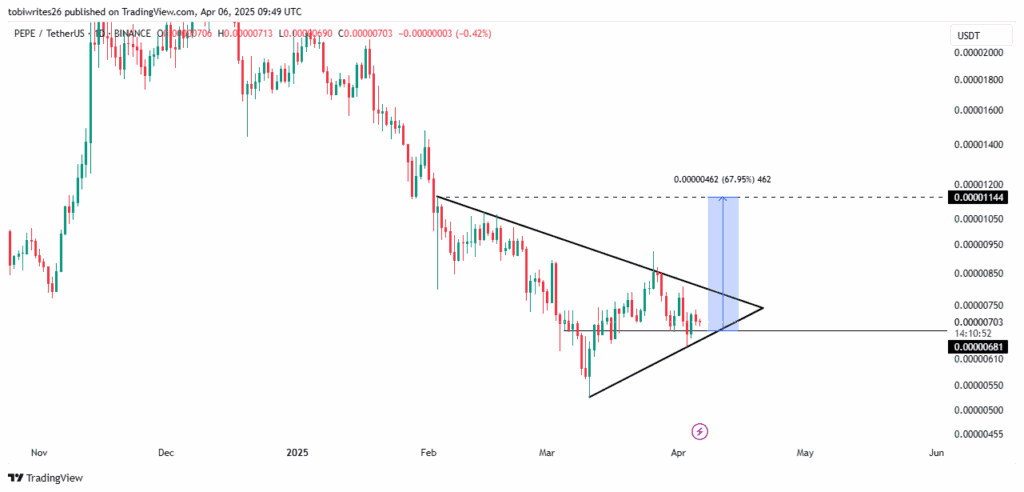 Recentemente, o PEPE evoluiu para um padrão de triângulo simétrico, caracterizado por linhas de suporte e resistência convergentes. De acordo com a análise, esse padrão poderia potencialmente desencadear um importante rali de alta. A projeção de preço desta criptomoeda pode atingir $0,00001144. No entanto, antes desse aumento se concretizar, o preço do PEPE deve primeiro cair, indo até o nível de suporte de $0,00000681.