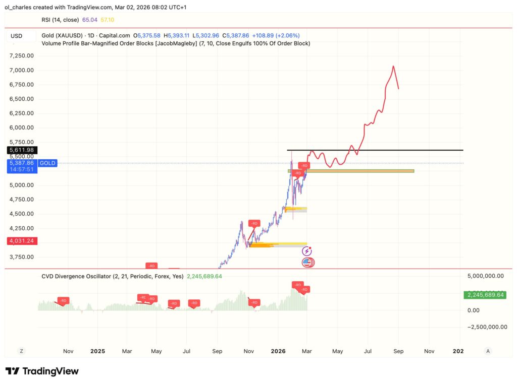 O mercado das matérias-primas está em ebulição. Nas últimas 24 horas, o Ouro defendeu firmemente o seu suporte psicológico dos 5200 $, sendo negociado em torno dos 5387,90 $ nesta segunda-feira, 2 de março de fevereiro. Esta subida diária de 1,83% não é insignificante: sinaliza uma pressão de compra constante por parte dos investidores institucionais e dos bancos centrais.