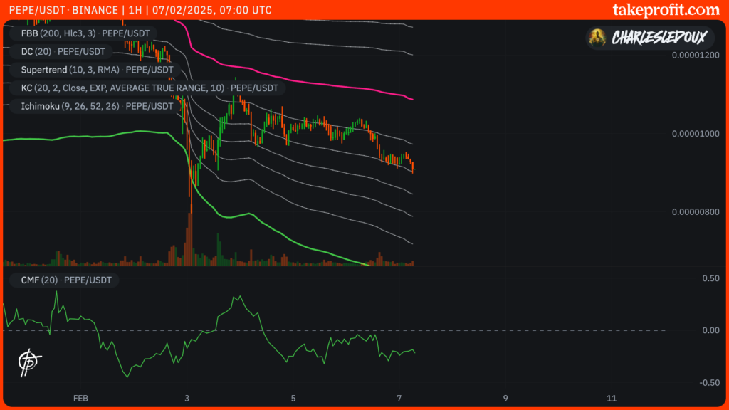 A curto prazo, o PEPE está se segurando em um suporte de Fibonacci. O próximo está em 0,0000084 dólares. O Chaikin Money Flow indica que a pressão de venda ainda está presente e a liquidez ainda não é ideal.